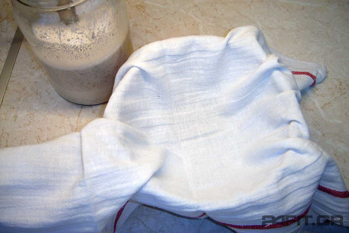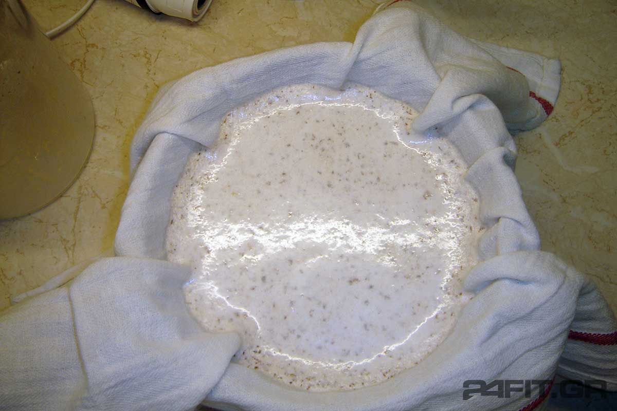 Ρίχνουμε το μίγμα σιγά σιγά πάνω στην πετσέτα και το αφήνουμε να στραγγίσει. Μπορούμε να βοηθήσουμε στο στράγγισμα ανακατεύοντας το μίγμα με ένα κουτάλι.
