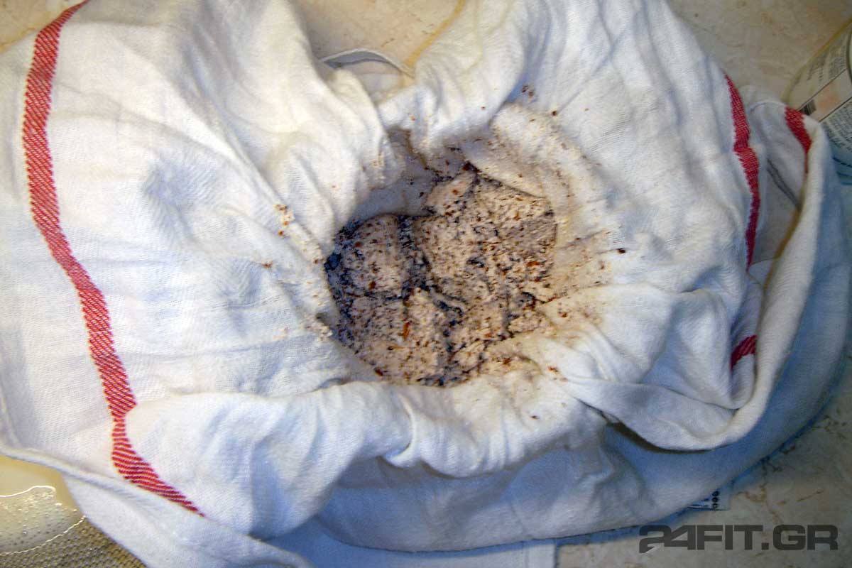 Μόλις στραγγίσει από τα πολλά υγρά πιάνουμε τις άκρες της πετσέτας όλες μαζί στην κορυφή δημιουργώντας ένα πουγκί και το στύβουμε καλά να στραγγίσουν εντελώς όλα τα υγρά.